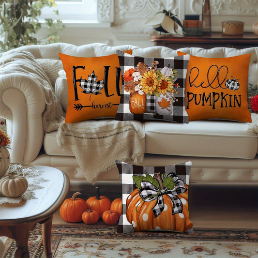 Autumn Harvest Pillow Covers – Farmhouse Fall Décor with Pumpkin & Buffalo Check Design, Thanksgiving Pillow Cases for Sofa, Bed & Living Room